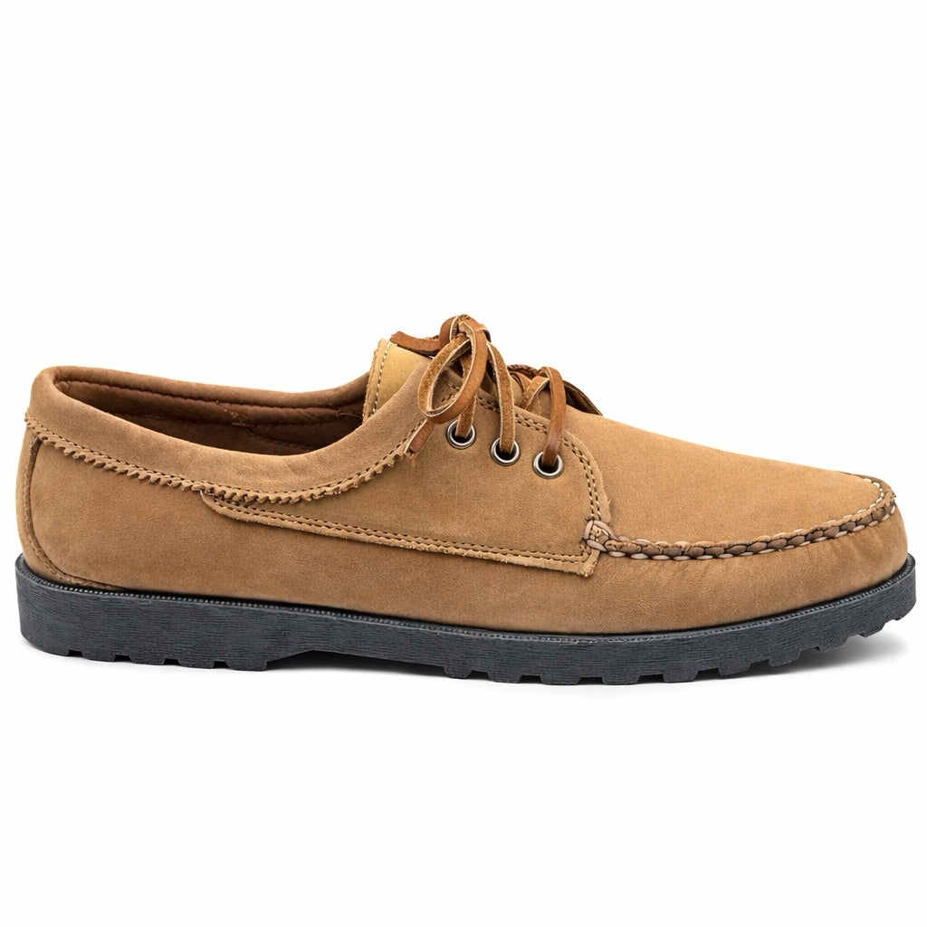 We blend the construction of a classic moccasin with a traditional blucher’s open lacing system for a shoe that cradles your foot in comfort and is easy to step into and take off. Uppers are tooled in pull-up leather or suede. The Vibram®️ Comfort Lug outsole is proprietary to Quoddy, designed to be the most comfortable sole we use and to give superior wet or dry traction underfoot. Finished with pinking around the collar, lacquered eyelets and rawhide laces. Handmade in Maine using globally sourced materials.